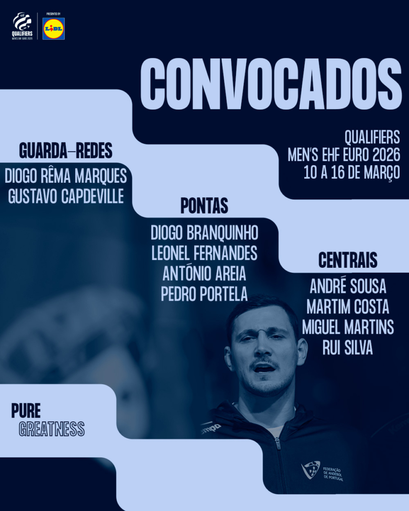 Embalada pelo sucesso sem precedentes no mais recente Campeonato do Mundo, a Seleção Nacional A Masculina vai agora centrar atenções nos Qualifiers do Men’s EHF EURO 2026 e no horizonte está o primeiro jogo em solo português após a brilhante campanha mundial. A contar para as Rondas 3 e 4 do Grupo 5, Portugal vai defrontar a Polónia em dose dupla e em caso de triunfo na ERGO Arena, na cidade de Gdańsk, no dia 13 de março, poderá festejar o apuramento em Odivelas, três dias depois, com casa cheia, naquela que se espera uma comunhão perfeita entre adeptos e Heróis do Mar. A comitiva lusa reúne-se esta segunda-feira, em Lisboa.