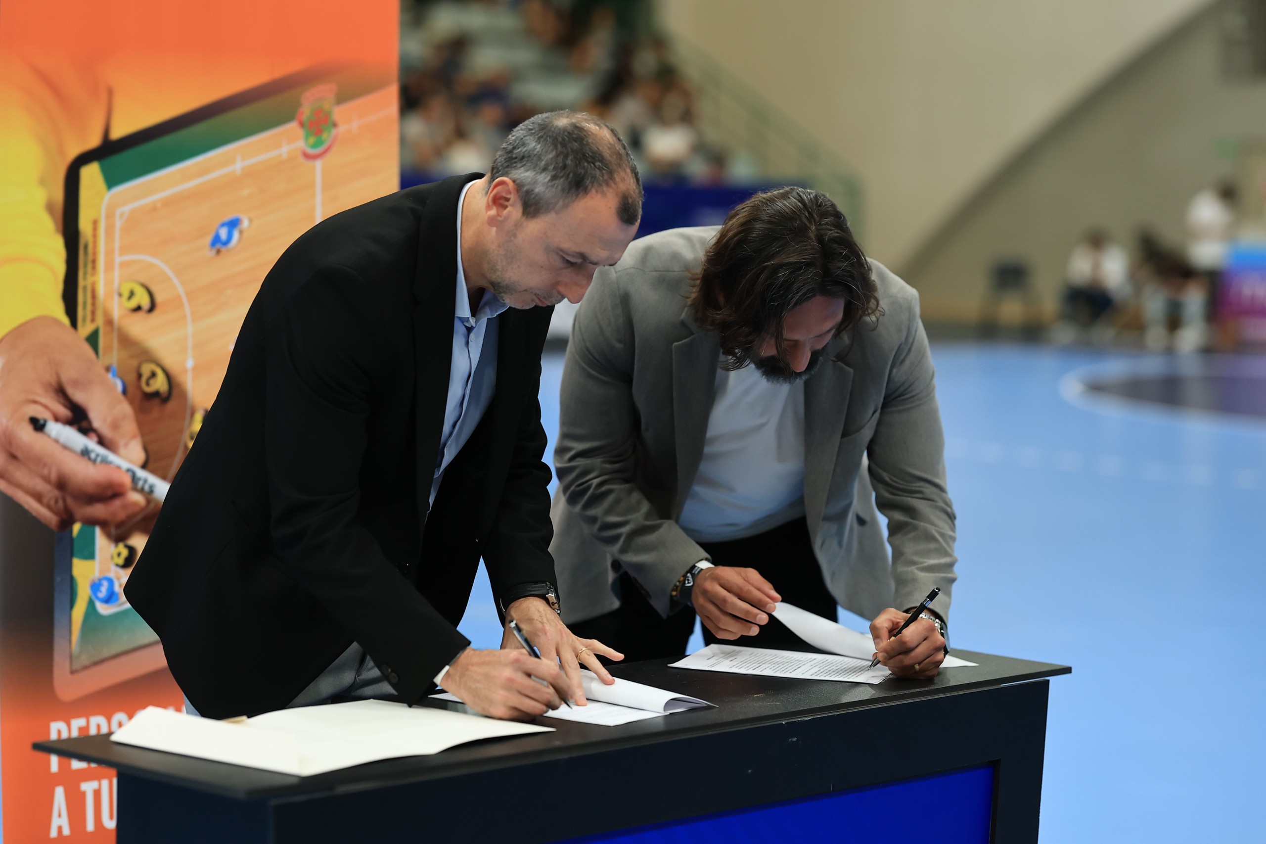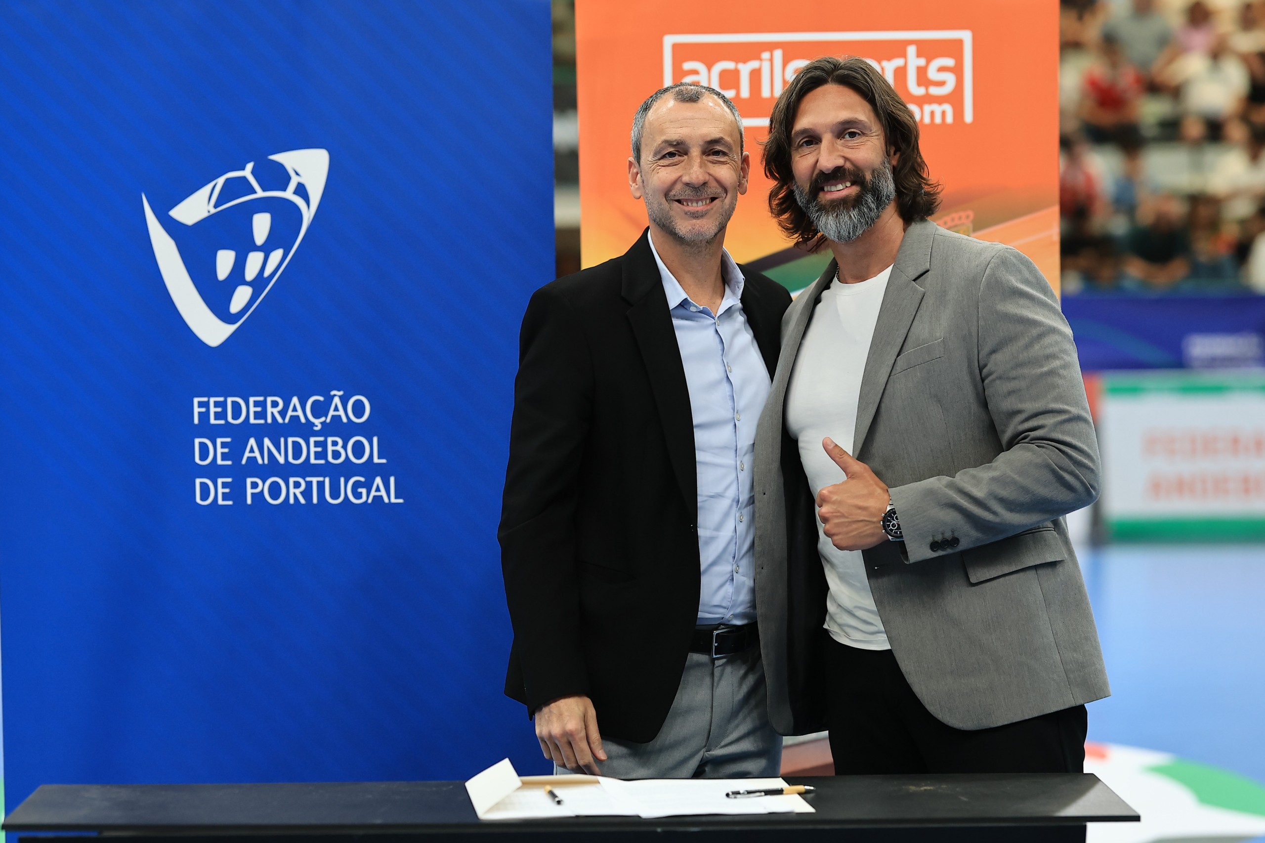 Durante o intervalo, Miguel Fernandes, Vice-Presidente da Federação de Andebol de Portugal e João Pinto, Brand & Sales Manager da Acrilsports, protagonizaram um momento protocolar com a assinatura de contrato de parceria entre as entidades até 2028.