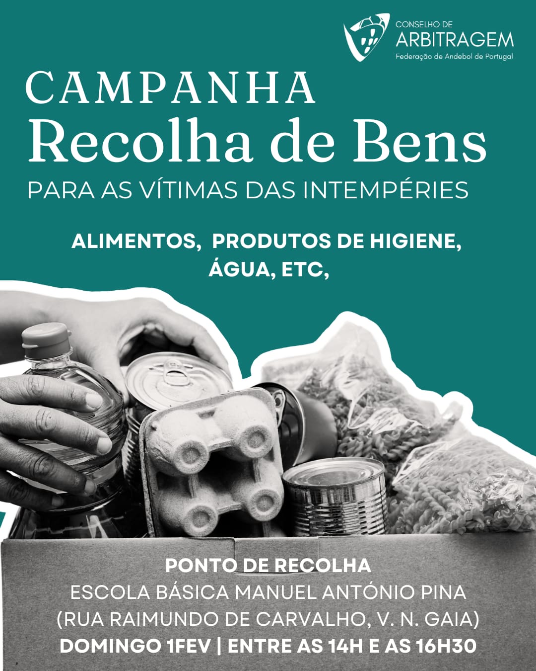 O Conselho de Arbitragem da Federação de Andebol de Portugal manifesta a sua solidariedade para com as populações afetadas pelas recentes tempestades que assolaram o país. Nesse sentido, promove uma iniciativa de recolha de bens essenciais, com foco em alimentos básicos, produtos de higiene e água potável, destinados a apoiar de forma direta e imediata as vítimas destas condições meteorológicas adversas.